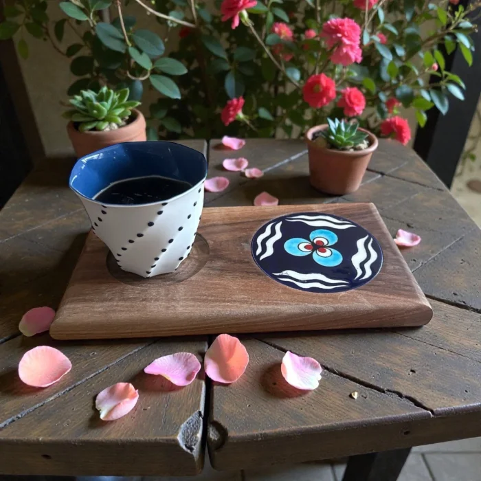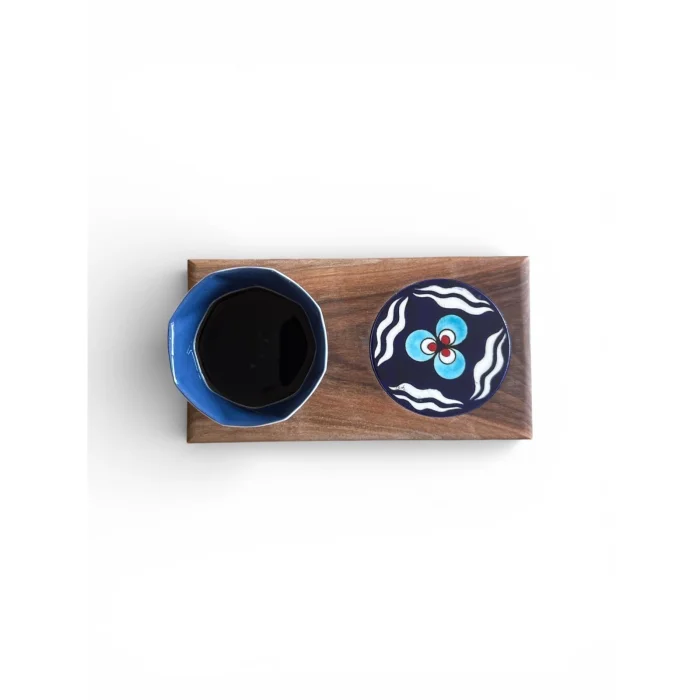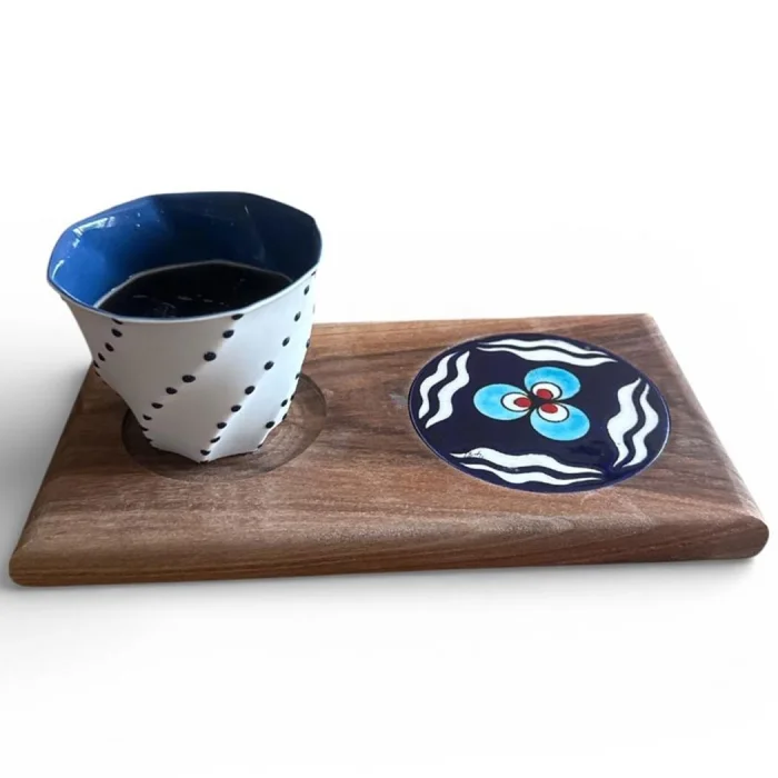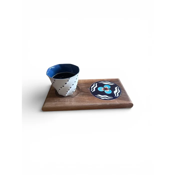 Ceviz masif çini el boyama detaylı içecek sunum tabağı ve porselen limonges kahve bardağı